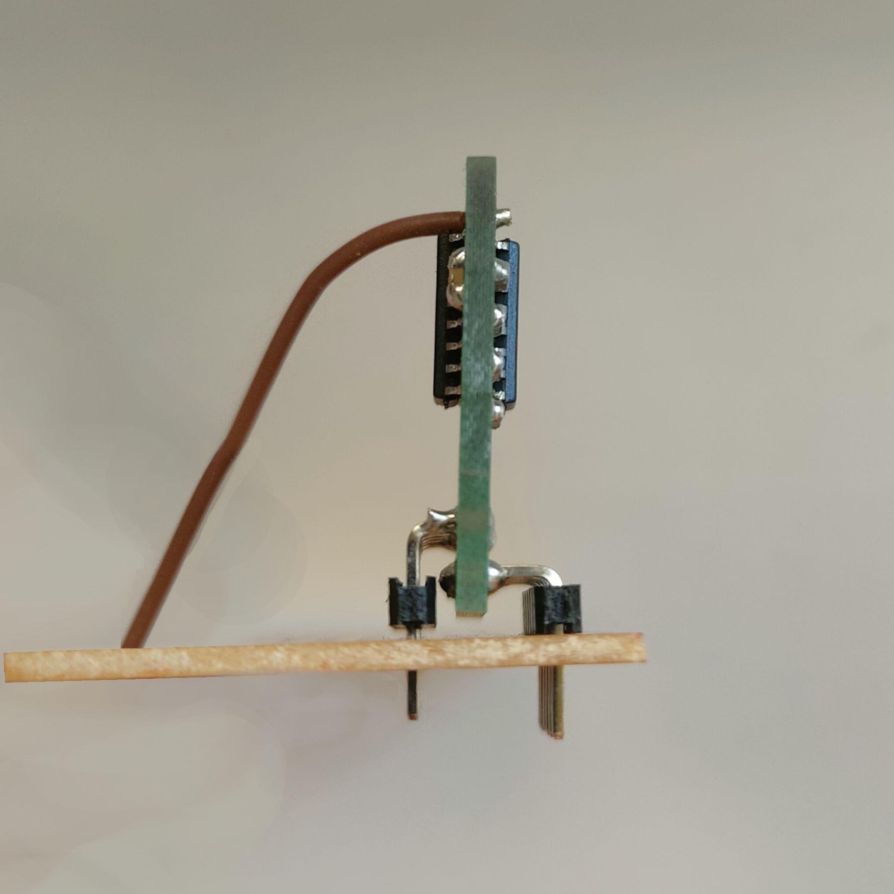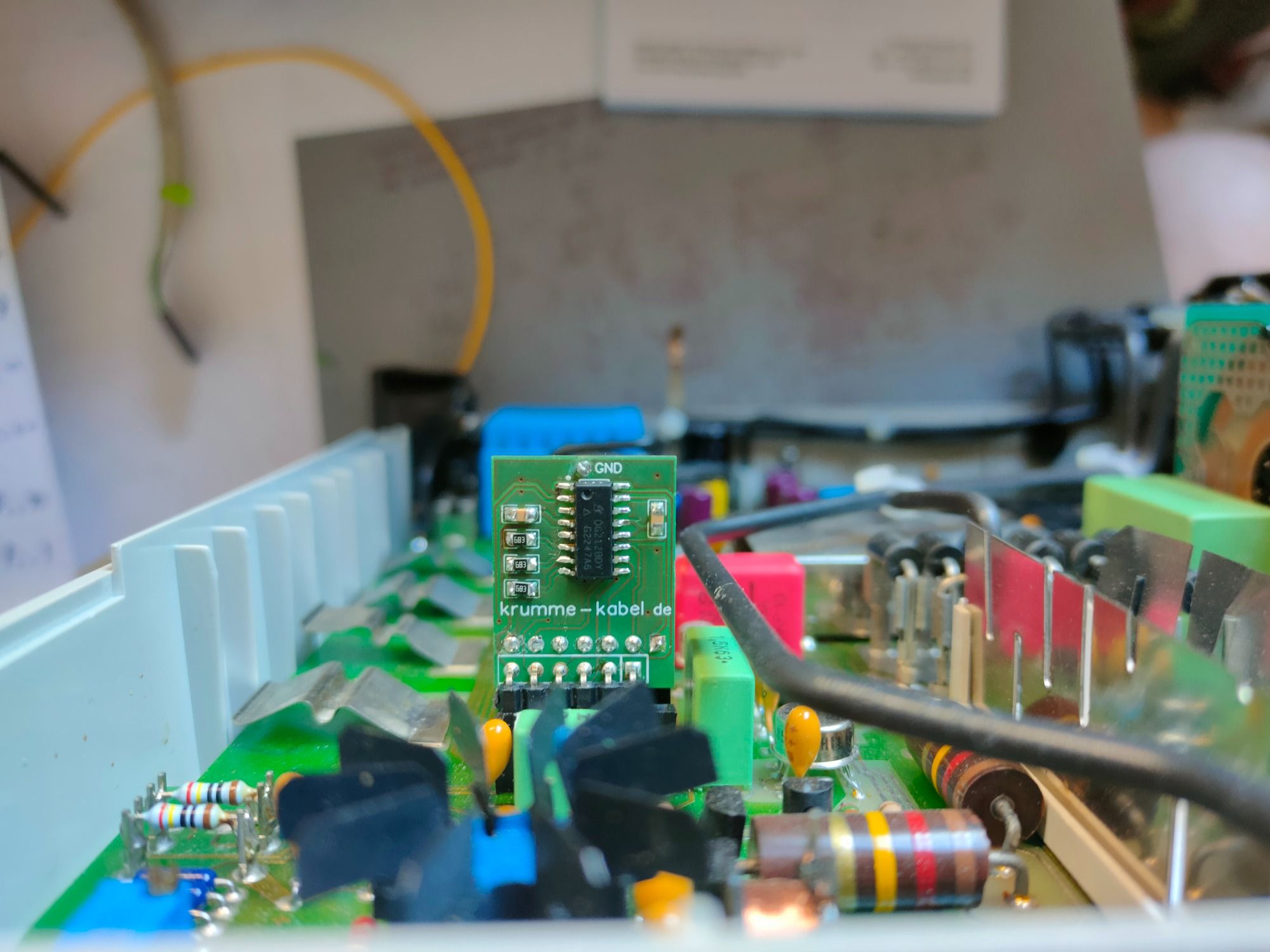 Da an den Anschlüssen des ICL8053A keine Masse angeschlossen ist, wird mithilfe eines externen Kabels die Masse von einer benachbarten Abschirmung abgegriffen (siehe Bild). In der ersten Verision der Ersatzschaltung war dies nicht der Fall, da hier die Masse über Pin4 geleitet wurde. Laut Schaltplan des MA5D sollte an diesem Anschluss Masse anliegen, aber in der Praxis hat diese Verbindung nicht funktioniert.